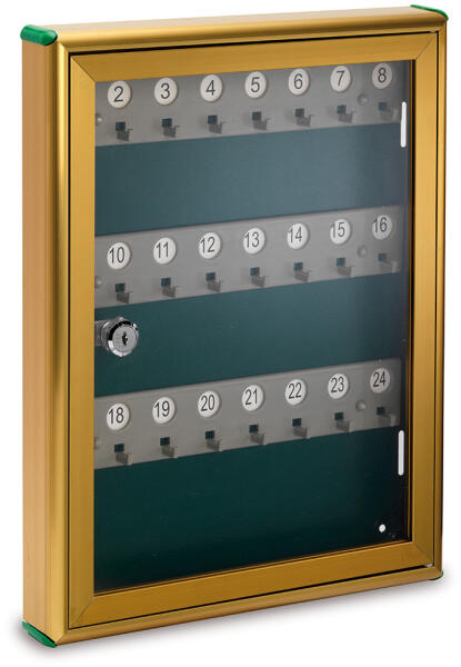 24 akasztós kulcsszekrényeloxált alumínium ház és ajtókeret átlátszó plexi ajtóbetétszámozott, fix kulcsakasztókrögzítő furat a hátoldalonkettő darab kulccsalbronz színbenrögzítő csavarokkal áruljuk