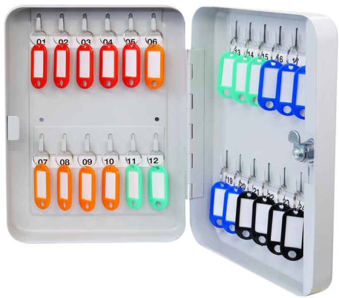 A névcímkéknek köszönhetően a billentyűket szín szerint megkülönböztethetiTS 24 kulcstartó A kulcstartó nagyszerű megoldás a kulcsok biztonságban tartására. 24 kulcshoz tervezték, minden horog számozott, így mindig tartsa őket rendben. A csomag színes névcímkéket és kulcstartókat is tartalmaz. A szekrény tartós és mindenekelőtt biztonságos, köszönhetően az acélnak, amelyből készült. Van hozzá zár is, melyhez 2 db kulcsot adunk. A szekrény súlya 1,01 kg.