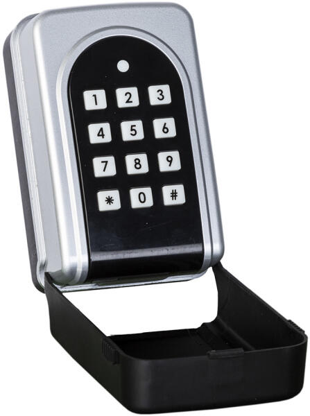 masszív kulcstároló széf elektronikus számzár megvilágított billentyűzet egy mesterkód (4-8 számjegy) és egy felhasználói kód (4-8 számjegy) zár 3 darab 1,5V-os elemmel működik (nem tartozék) külső elemmegtáplálás (elemlemerülése esetén) falra szerelhető (négy rögzítő furat) kültéri használatra is alkalmas (IP 44 védettség)
