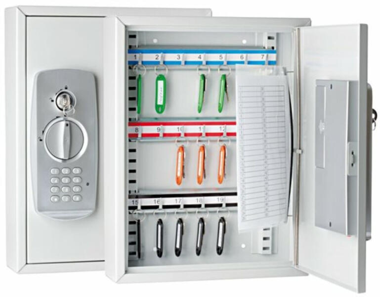 elektromos számzárral felszerelt acél szekrény egyidejűleg több felhasználó használhatja vészhelyzetben mechanikusan kulccsal nyitható kifordítható kulcsregiszterrel a jobb áttekinthetőség érdekében 2 számozott kulcs és 4 db AA elem tartozék méret: 27x09,5x35 cm tömeg: 2,75 kg