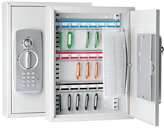 elektromos számzárral felszerelt acél szekrény egyidejűleg több felhasználó használhatja vészhelyzetben mechanikusan kulccsal nyitható kifordítható kulcsregiszterrel a jobb áttekinthetőség érdekében 2 számozott kulcs és 4 db AA elem tartozék méret: 27x09,5x35 cm tömeg: 2,75 kg
